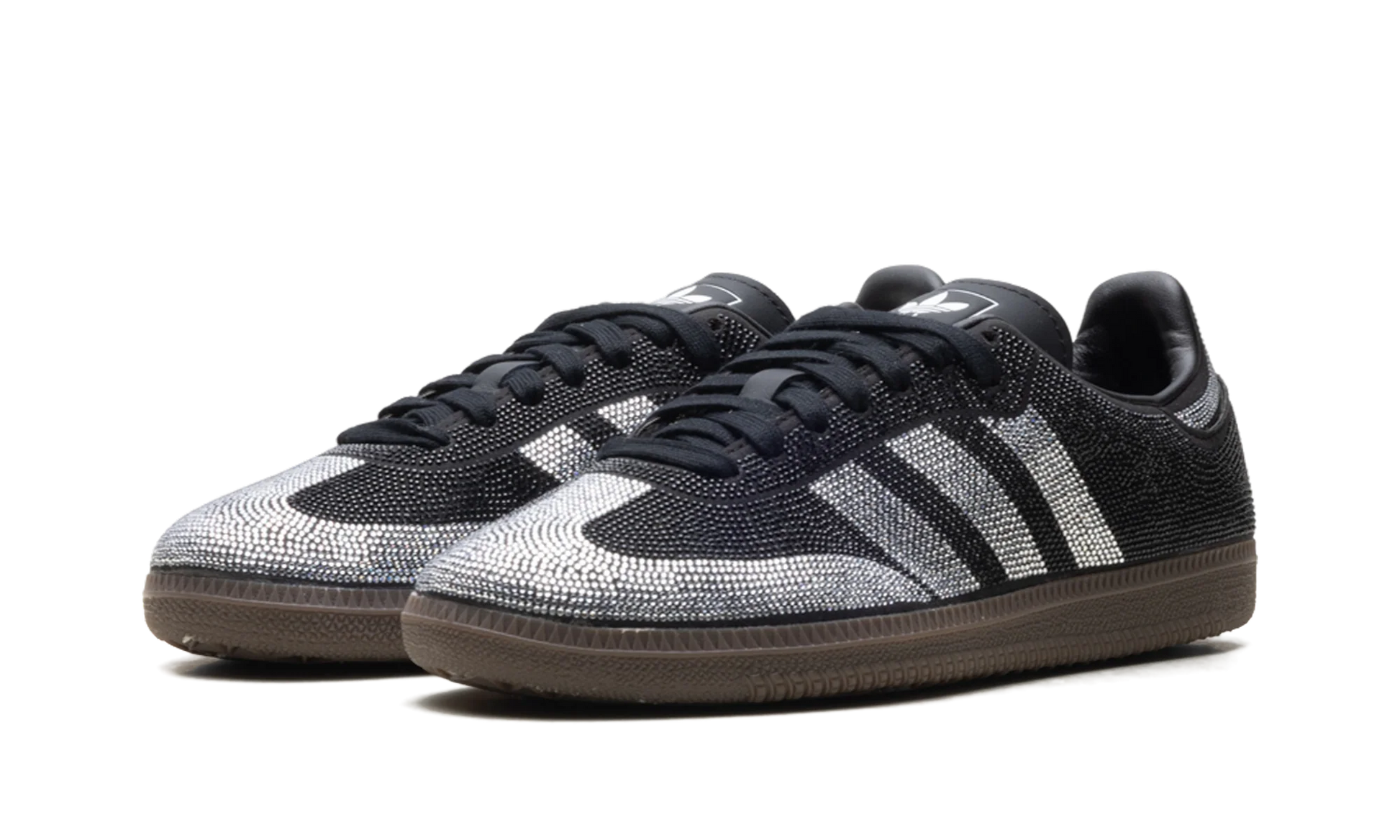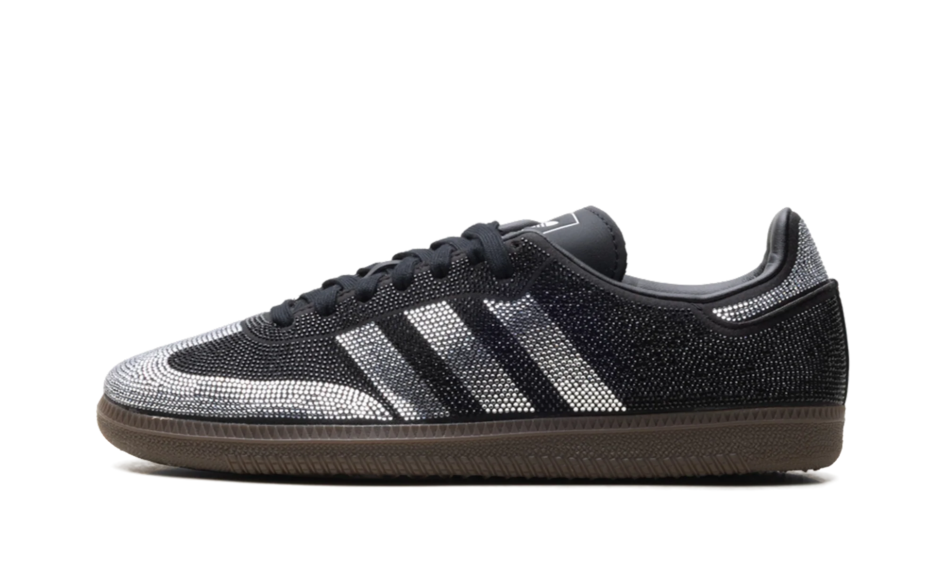 Les lignes iconiques de la Samba OG sont conservées : la toebox perforée pour la respirabilité, le renfort en suède à l’avant-pied, et la semelle basse emblématique qui a contribué à faire de la Samba un incontournable du streetwear. Les contrastes entre le noir profond, le gris neutre et l’éclat argenté des strass créent une palette dynamique sans jamais devenir excessive, garantissant une polyvalence stylistique.