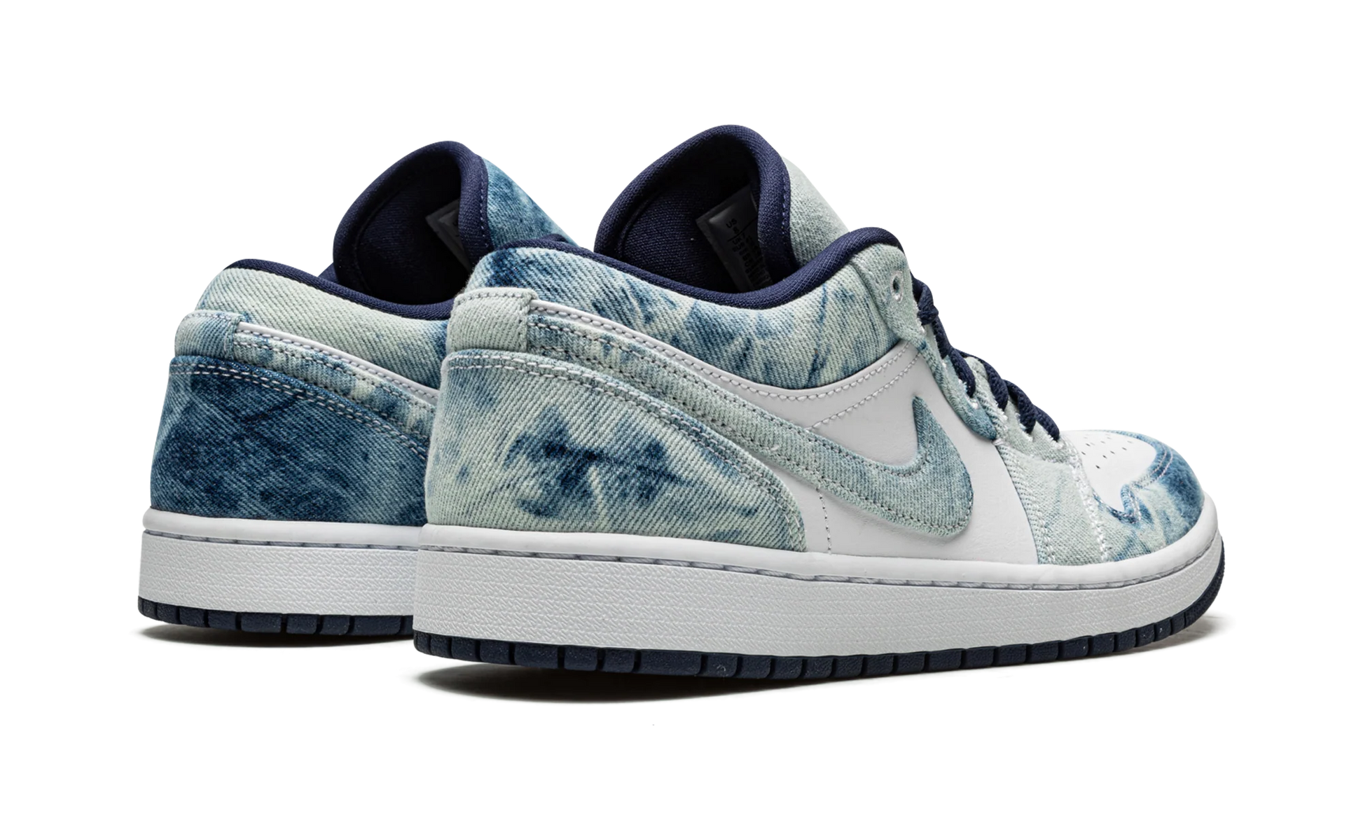 La tige associe un cuir blanc premium à des overlays en denim bleu lavé aux nuances subtiles, créant un contraste texturé unique. Les lacets bleu marine, la doublure assortie et le Swoosh en denim brut renforcent cette esthétique singulière, entre casual et premium. Le Jumpman brodé blanc sur la languette et le logo Wings embossé au talon rappellent les codes iconiques de la AJ1 Low tout en affirmant une identité fraîche et moderne.