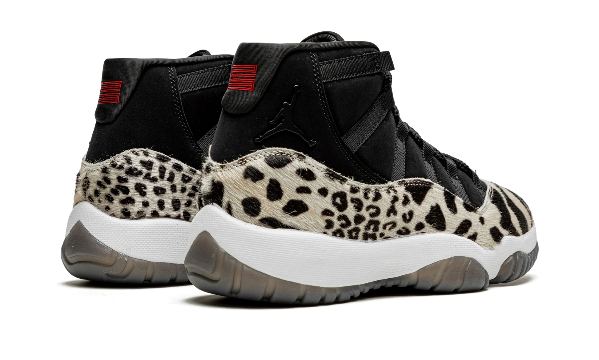 La tige associe un nubuck noir premium à un mudguard en fausse fourrure texturée, affichant un motif animalier subtil en noir ton sur ton. Cet effet “Animal Instinct” apporte profondeur, relief et caractère, tout en respectant la silhouette soignée de la AJ11. Les œillets métalliques et les lacets noirs créent une continuité élégante, tandis que le Jumpman rouge brodé sur le col ajoute une touche de contraste vibrante.