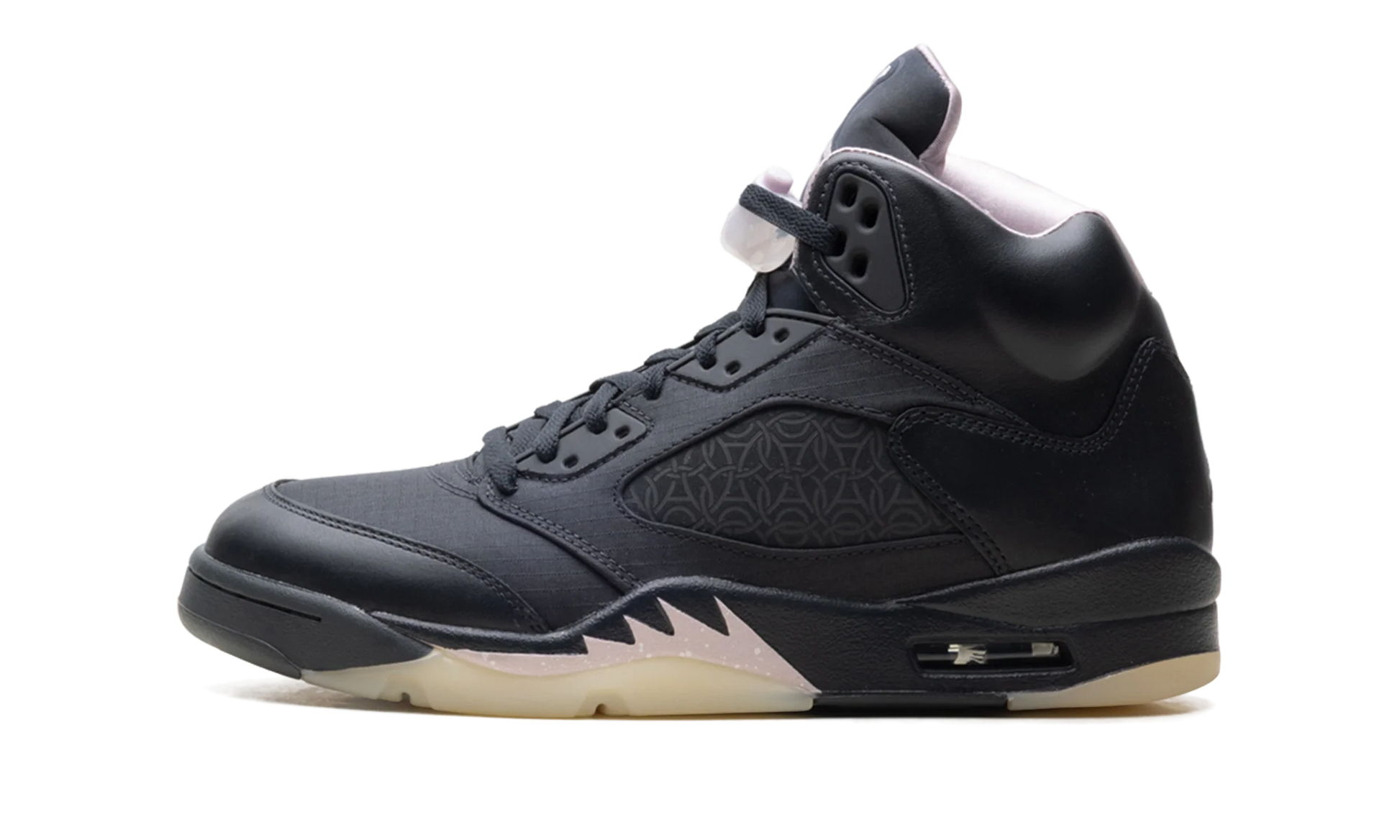 La tige adopte une construction en suede premium Off Noir profond, offrant une texture riche et une présence visuelle sophistiquée. Cette base sombre met en valeur les éléments signatures de la Air Jordan 5 comme les panneaux en mesh, les œillets translucides et la languette réfléchissante, tout en apportant une lecture moderne et épurée. Des accents subtils inspirés de l’univers PSG renforcent l’identité collaborative sans surcharger le design, conservant un équilibre parfait entre sobriété et caractère.