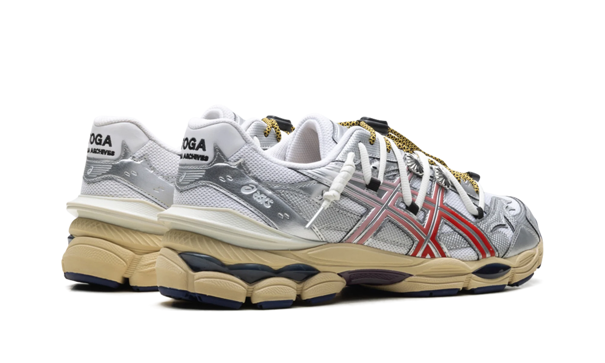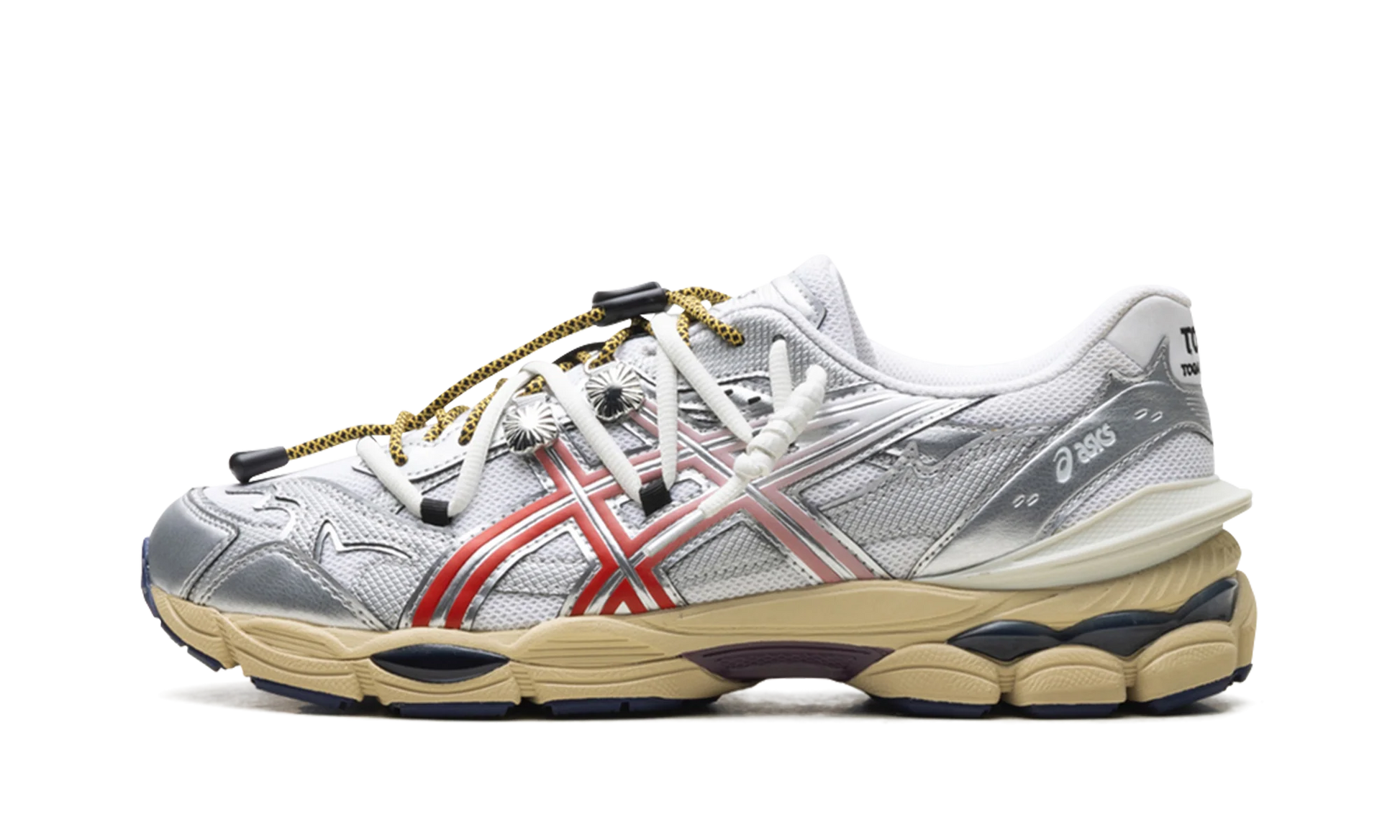 La tige associe un mesh blanc respirant à des overlays rouges qui dynamisent la silhouette. Des touches métallisées Pure Silver viennent structurer le modèle tout en apportant une dimension technique et élégante typique de TOGA. La paire intègre également des éléments décoratifs distinctifs, comme le système de laçage alternatif inspiré de l’univers utilitaire, signature des collaborations TOGA.