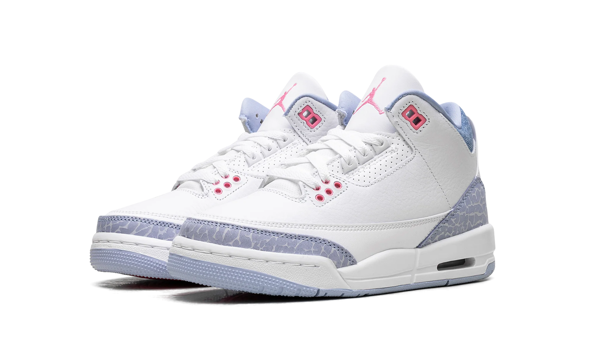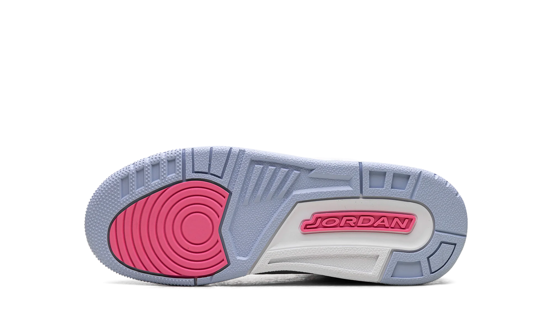 Côté confort, la paire s’appuie sur une semelle intermédiaire blanche intégrant l’unité Air visible au talon, signature de la Jordan 3, offrant amorti et souplesse au quotidien. La semelle extérieure translucide bleu clair assure une traction optimale, tout en ajoutant une finition moderne et élégante qui souligne l’équilibre général du design.