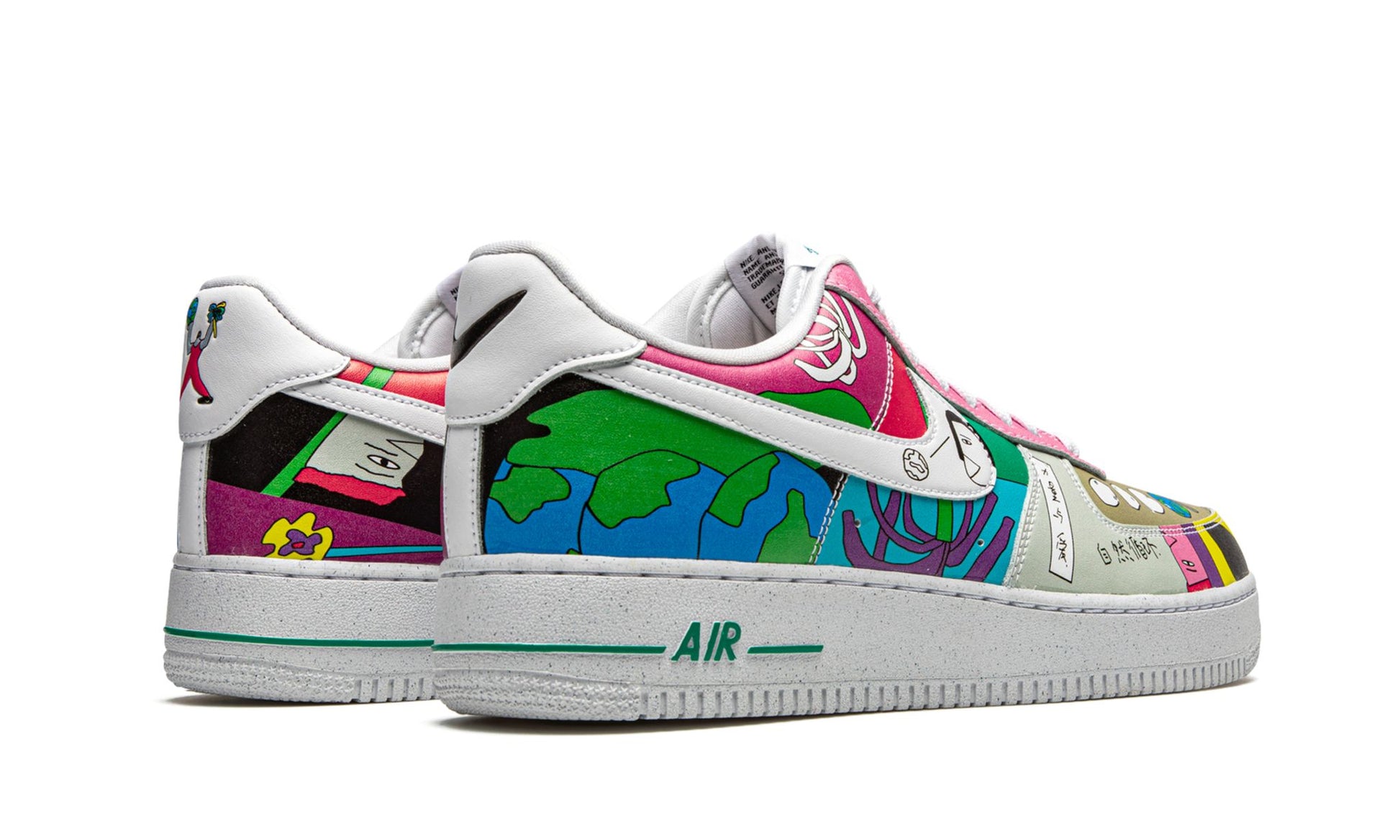 La tige est confectionnée en Flyleather, un matériau innovant composé d'au moins 50 % de fibres de cuir recyclées, soulignant l'engagement de Nike envers la durabilité. Les illustrations multicolores couvrent l'ensemble de la chaussure, incorporant des éléments abstraits et figuratifs dans des teintes vives comme le vert, le bleu, le rouge et le jaune. Chaque détail graphique symbolise une connexion entre l'humanité et la nature, invitant à une réflexion sur notre impact écologique.