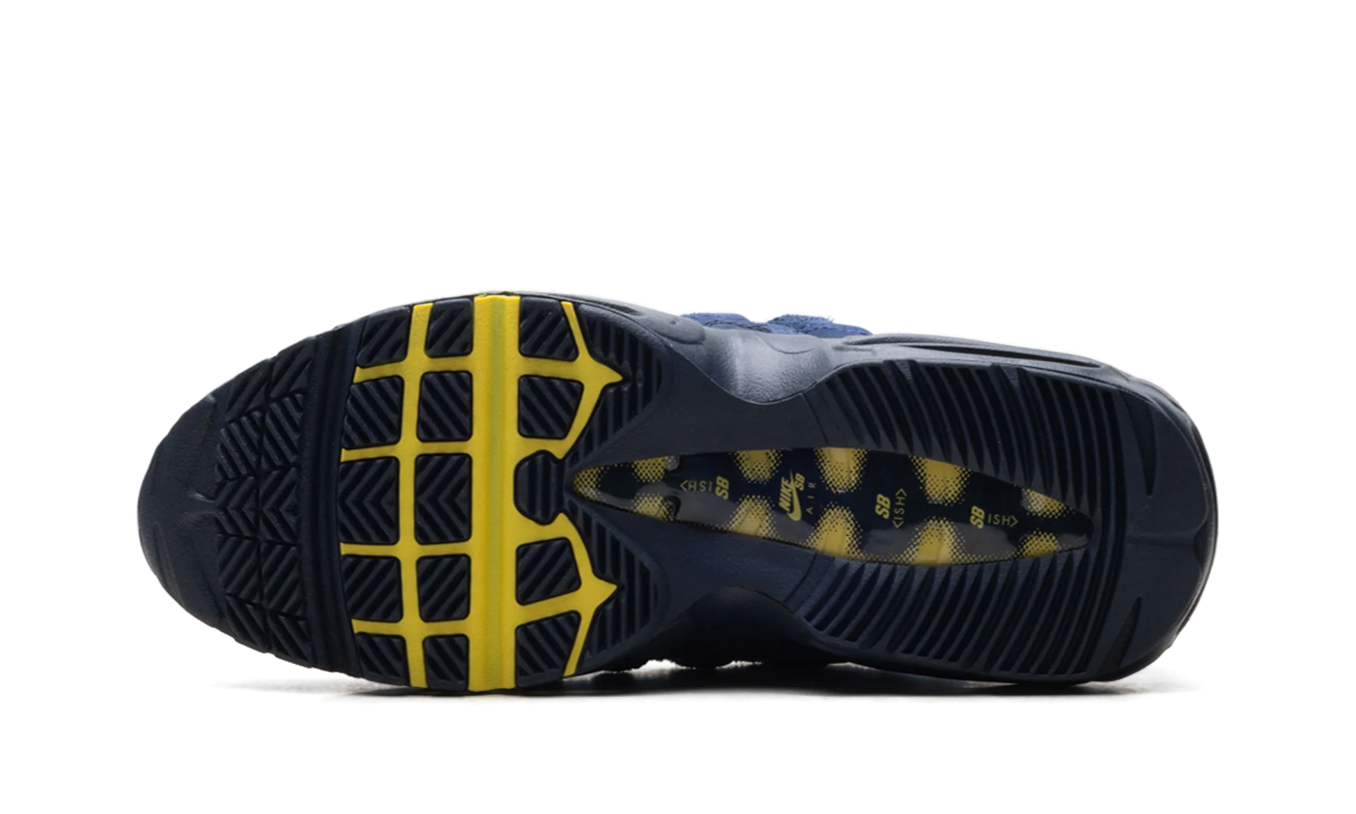 La tige reprend la construction en vagues superposées signature de la Air Max 95, mais l'interprète à travers une palette profonde dominée par l’Obsidian, le Navy et le Midnight Navy, créant un dégradé riche et texturé. Les touches Speed Yellow apportent une intensité vive et sportive, offrant un contraste dynamique qui évoque l’audace du skate moderne. Les accents Summit White et White équilibrent l’ensemble en apportant de la lumière et une esthétique nette.