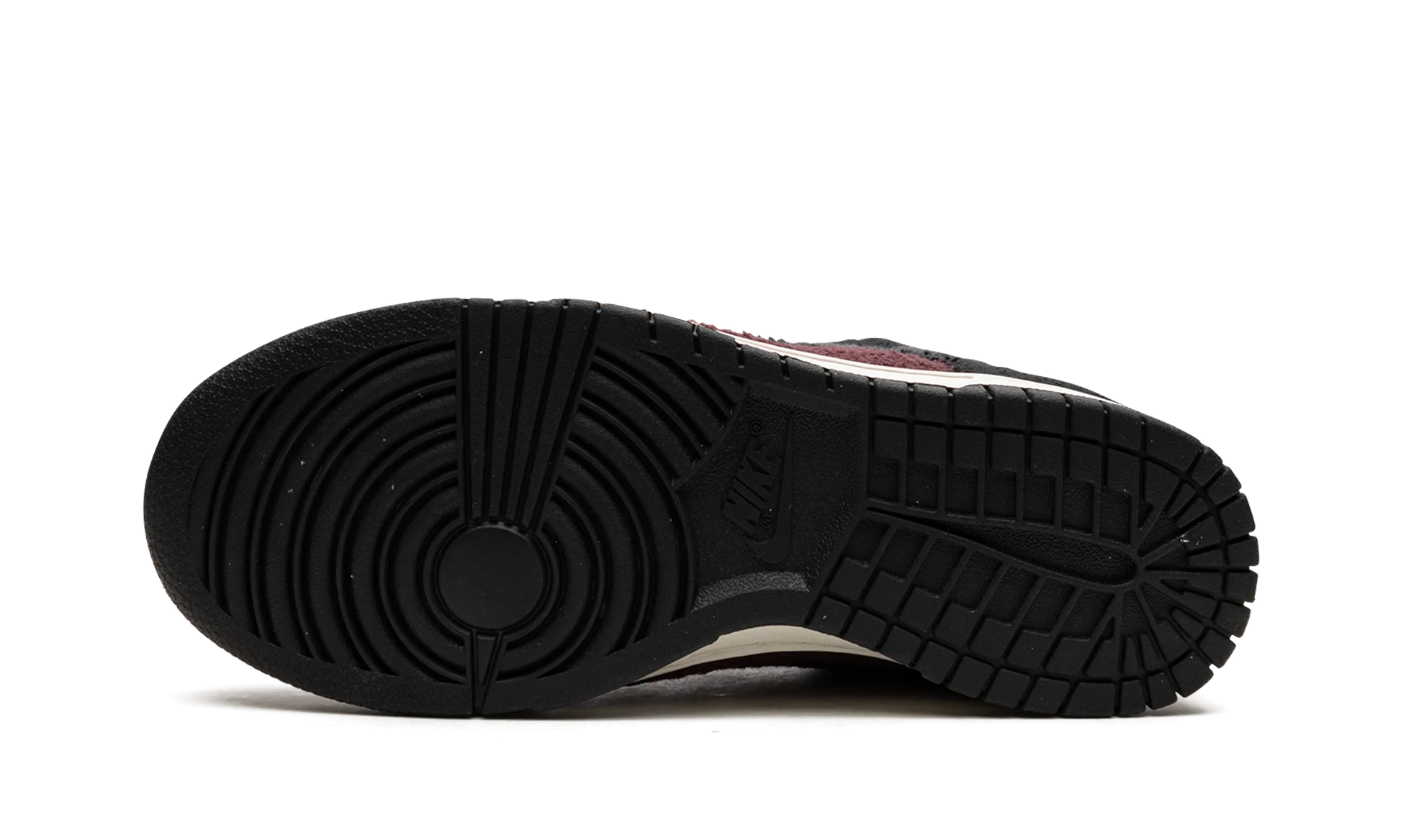 La tige est intégralement revêtue d’un fleece shaggy associant des panneaux en Burgundy Crush sur la toebox, les quartiers et le col, avec des éléments en noir profond sur le mudguard, les œillets et le talon. Le Swoosh et la doublure du col exhibent une nuance Dark Smoke Grey, avec un logo Nike brodé sur le talon qui souligne le caractère vintage du modèle. L’ensemble repose sur une semelle intermédiaire vieillie couleur sail, contrastée par une semelle extérieure en caoutchouc noir, fusion parfaite entre esthétique rétro et fonctionnalité traction.